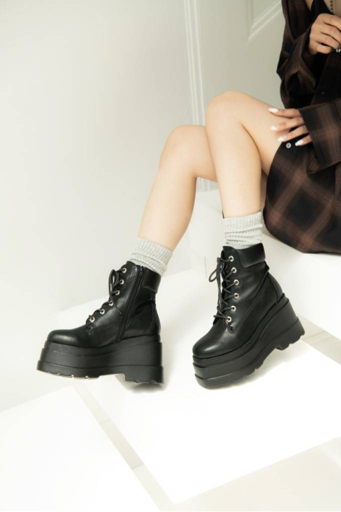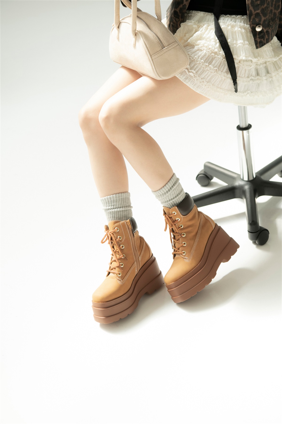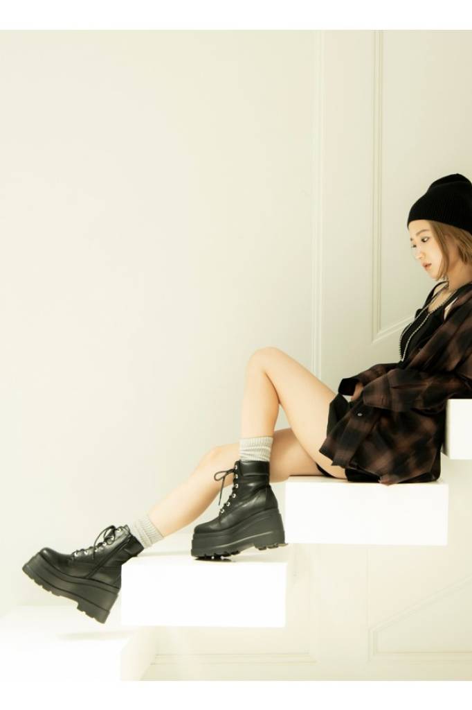 トレッキングブーツ風のレースアップデザインがスタイリングのアクセントに。