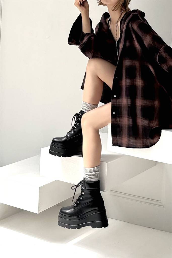 3段構造の厚底ソールが存在感を放つレースアップブーツ。