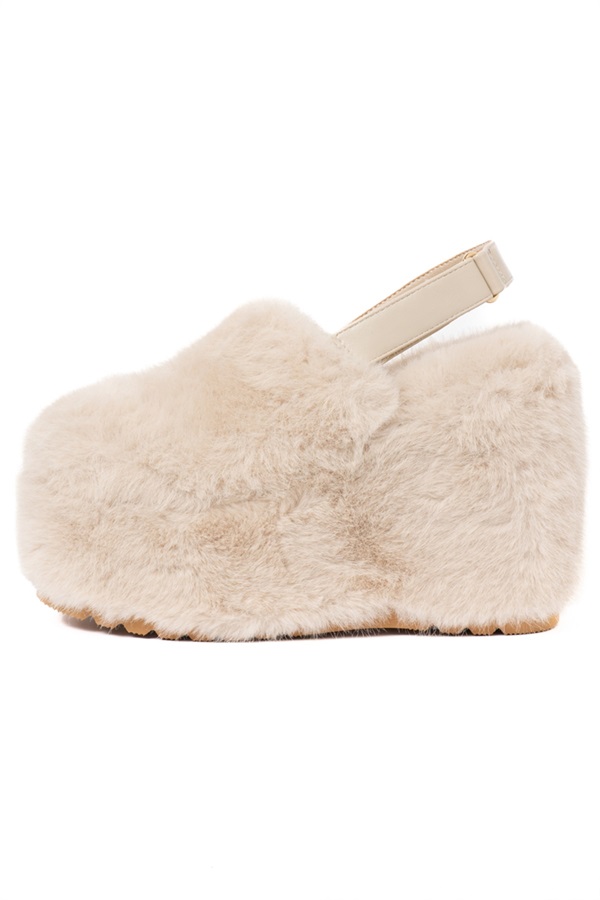 ソール部分までもフェイクファーで覆ったモコモコのフォルムが愛らしいアイテム。
