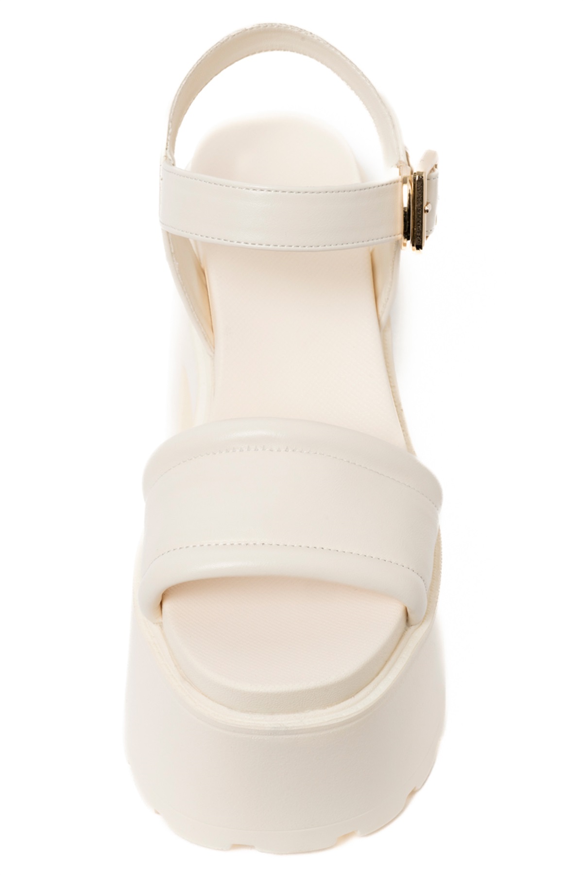 ぷっくりとラインを縁取った一枚ストラップのアッパーと、ゴールドのスクエアバックル付きのフックストラップでホールド感もバッチリ。