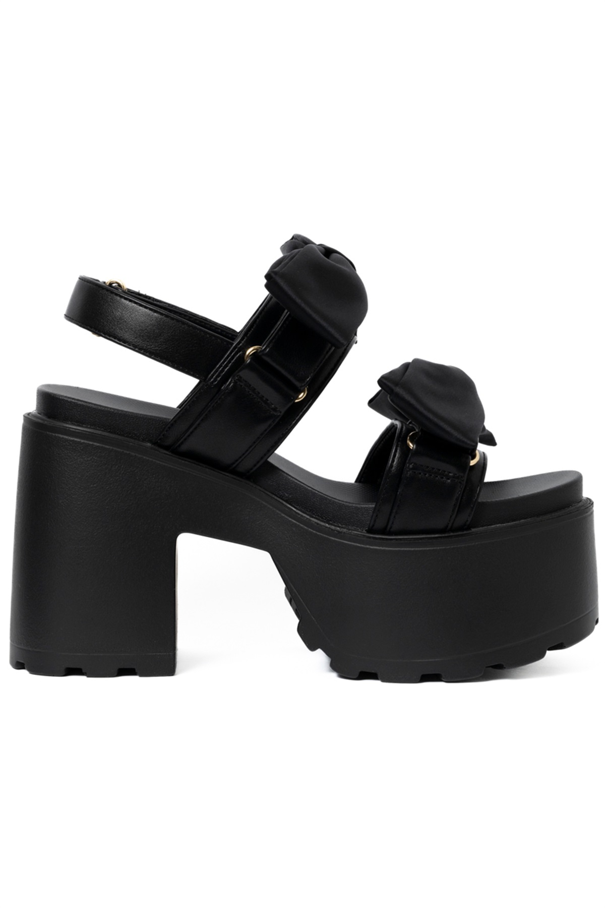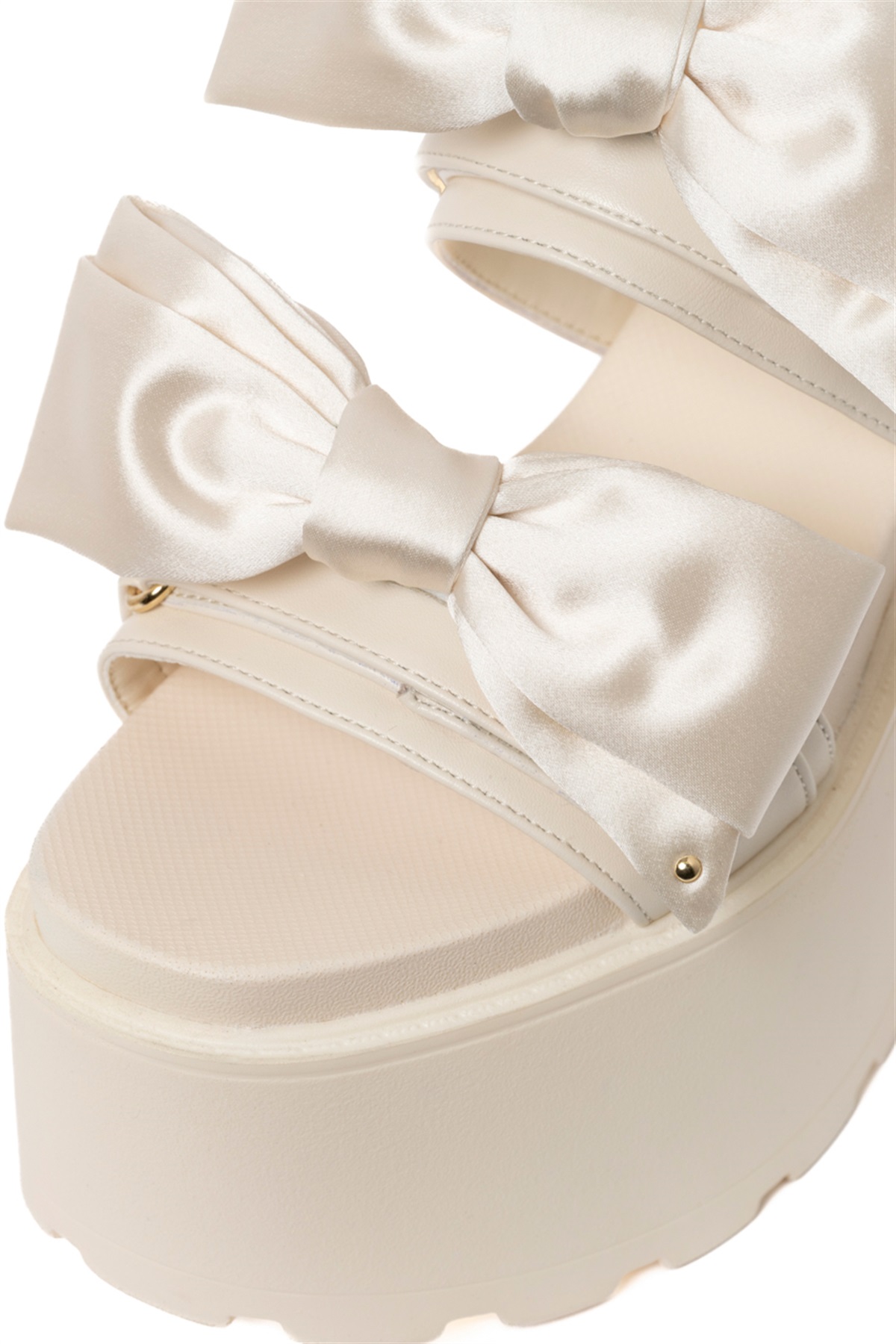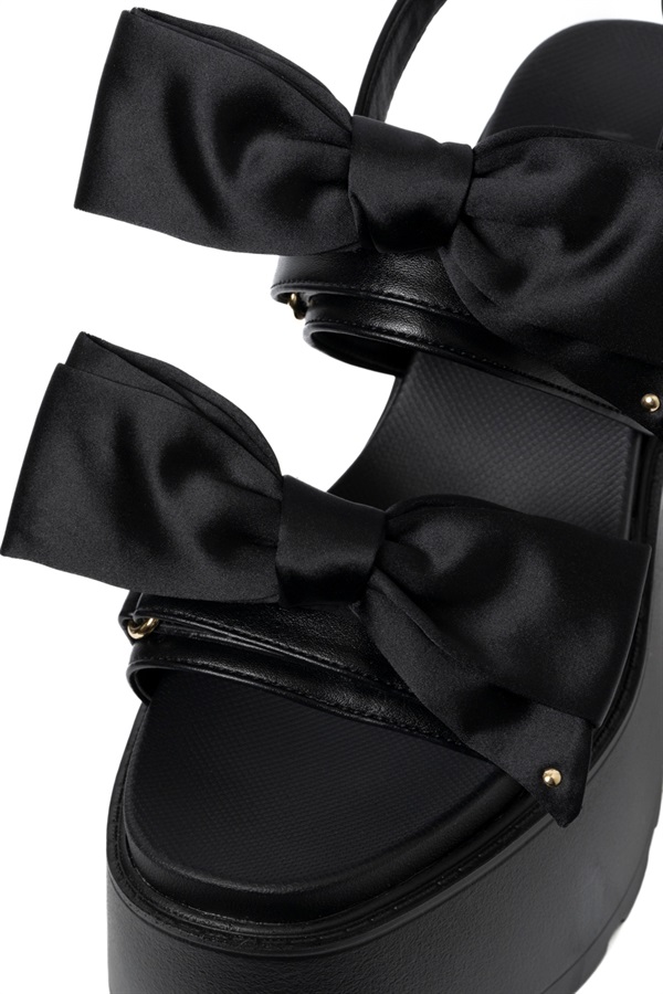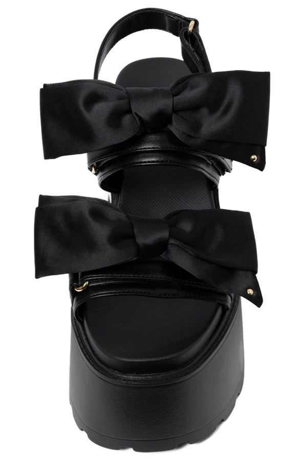 大ぶりのサテン調のリボンがフェミニンムード漂う厚底サンダル。