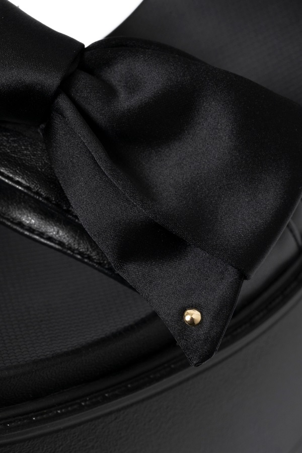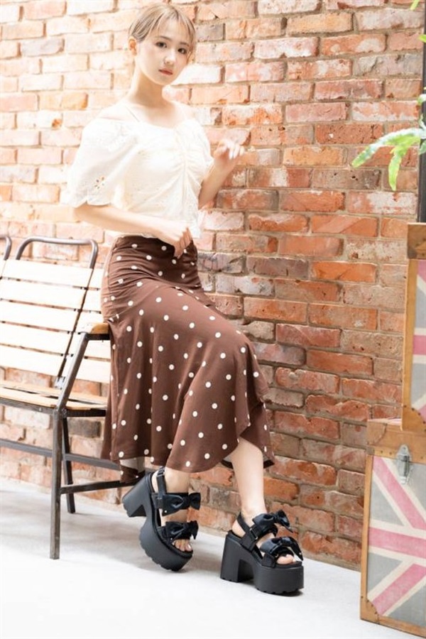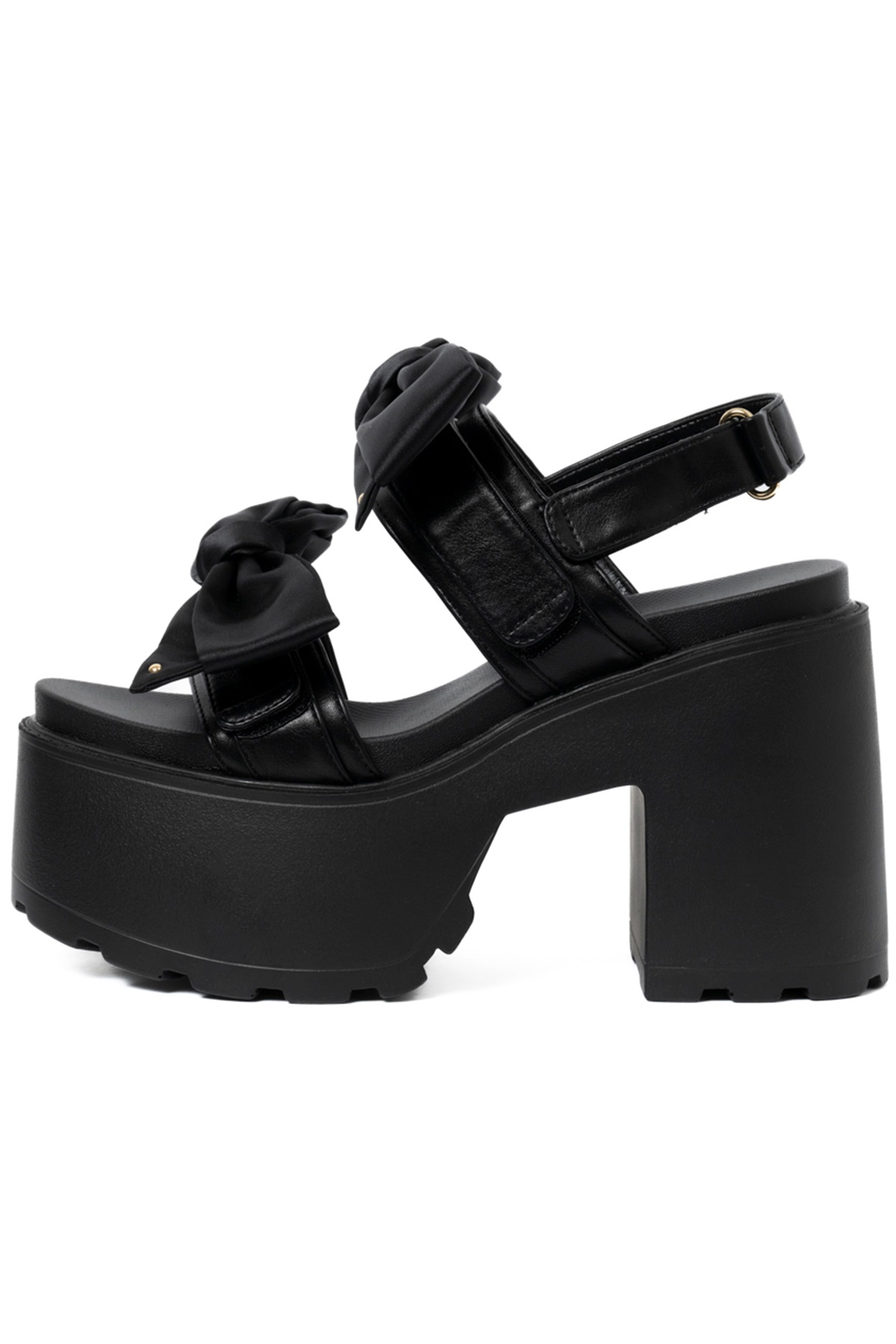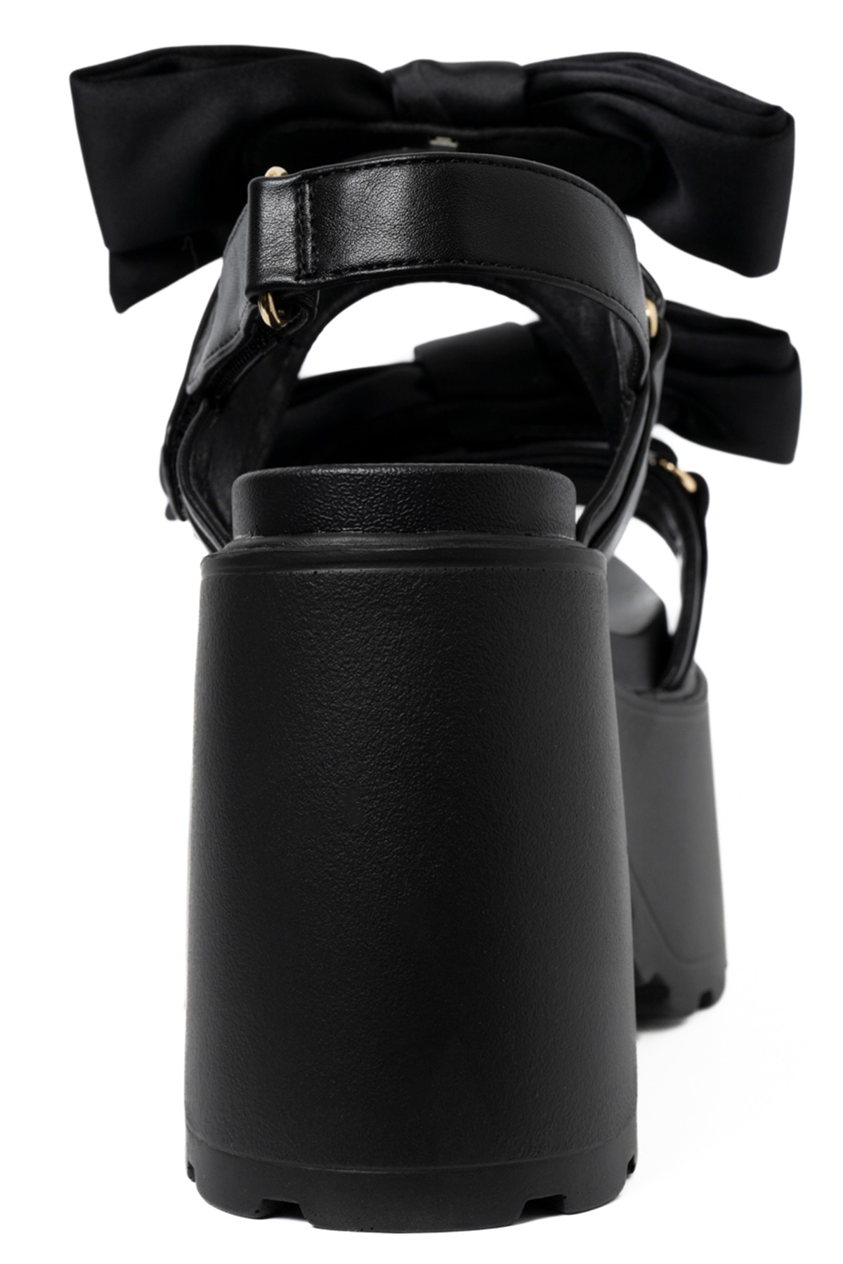 大ぶりのサテン調のリボンがフェミニンムード漂う厚底サンダル。