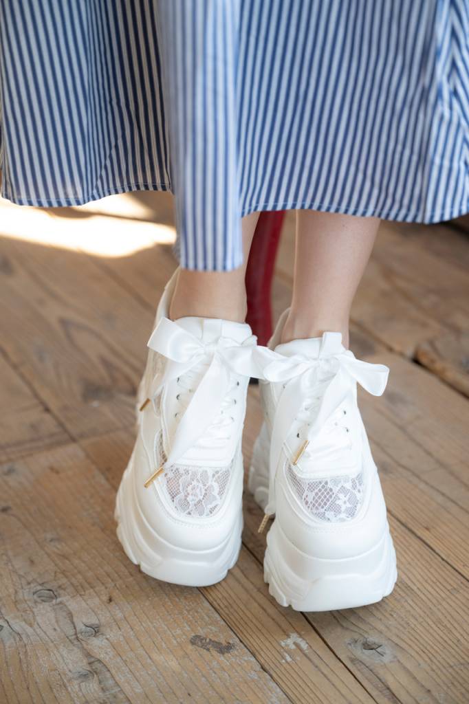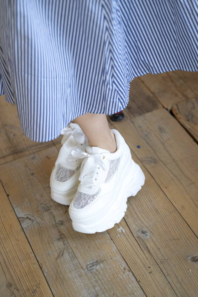 カジュアルなスニーカーだけど、アッパーにはレース素材を使用しフェミニンな印象をプラス。