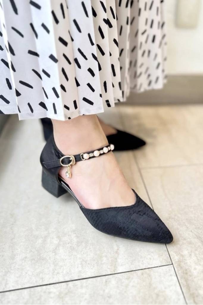 REZOY パールストラップポインテッドトゥラメヒールパンプス